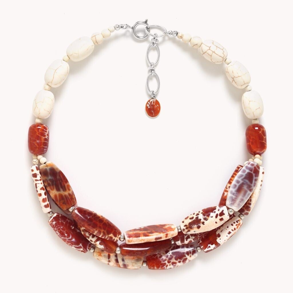 Ce bijou de la collection Terra Cotta nous transporte entre les nuances orangées de la terre cuite et la clarté du désert de sel de Bolivie. Cette ligne de bijoux brute et contrastée dévoile une composition de matières naturelles où les taches blanches de l'agate reflète l'aspect craquelé d'une terre assoiffée de lumière, parfaitement contrebalancé par l’éclat de l'howlite blanche. Laissez-vous séduire par le caractère intriguant de ces pièces fortes dont la structure simple s'accompagne d'une élégante touche d'argent.