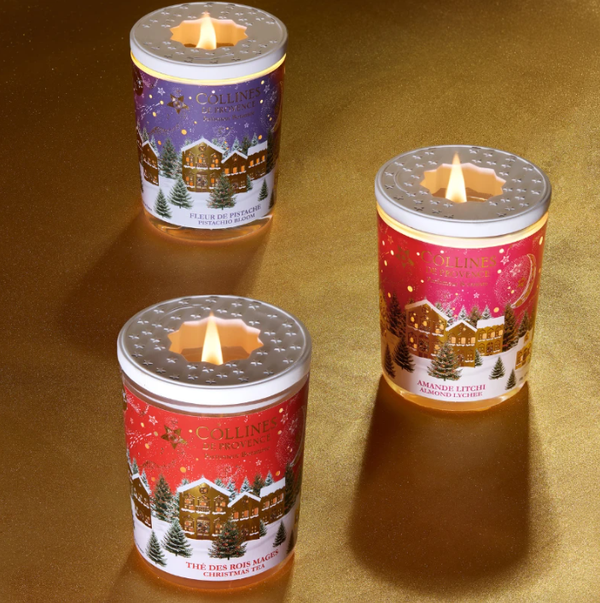 Découvrez la nouvelle bougie parfumée Noël Thé des Rois Mages coulée à la main dans nos ateliers en Haute Provence : Bougie coulée à la main Parfum de Grasse Une mèche bois qui crépite comme un feu de cheminée Capot céramique lampion Village de Noël scintillant